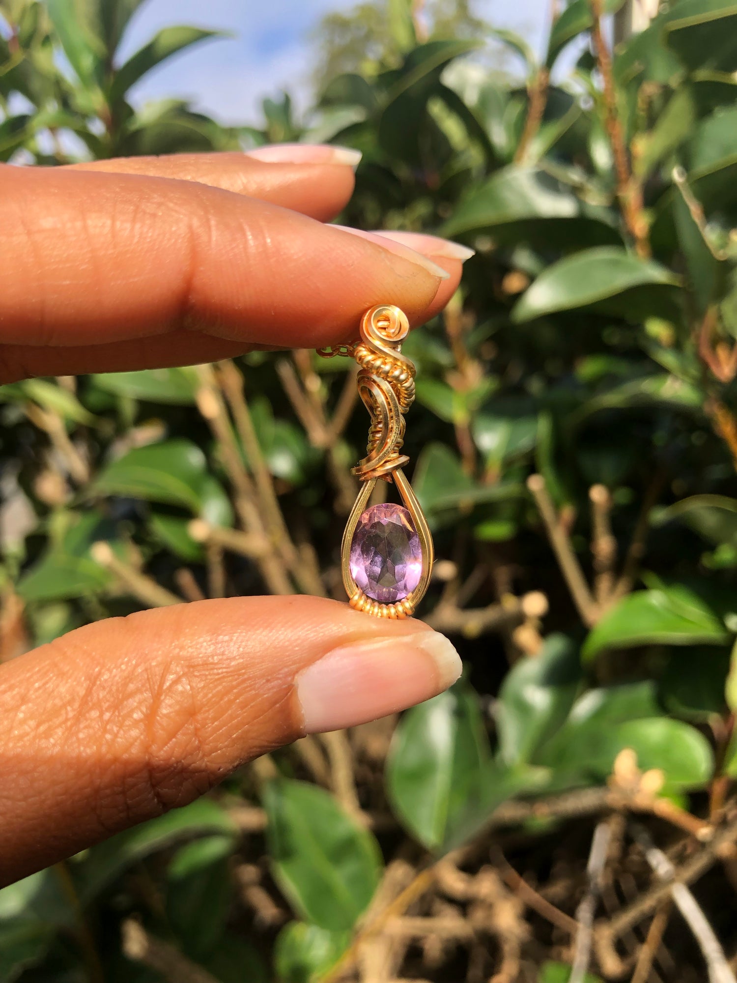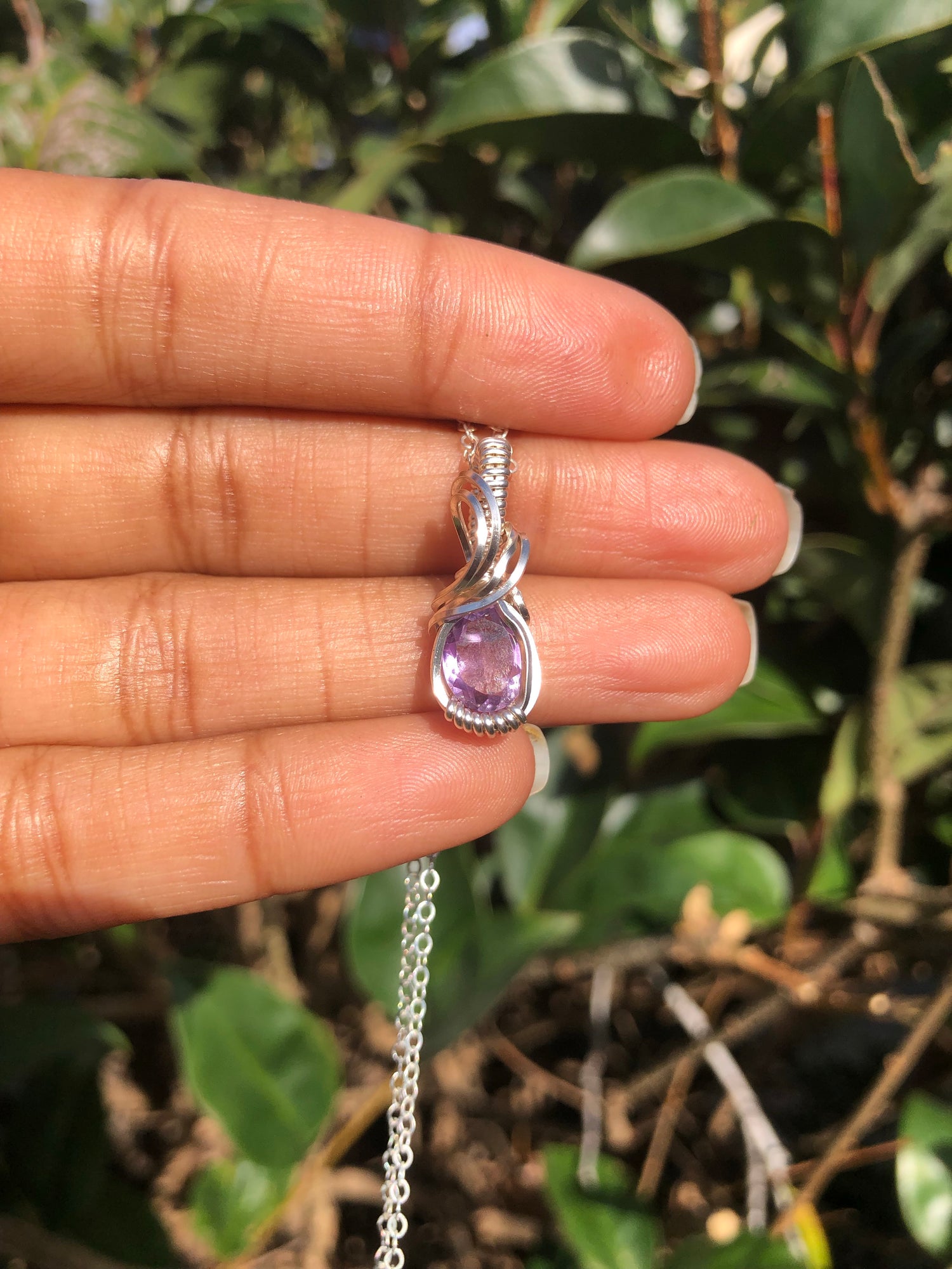 A custom hand wrapped amethyst necklace