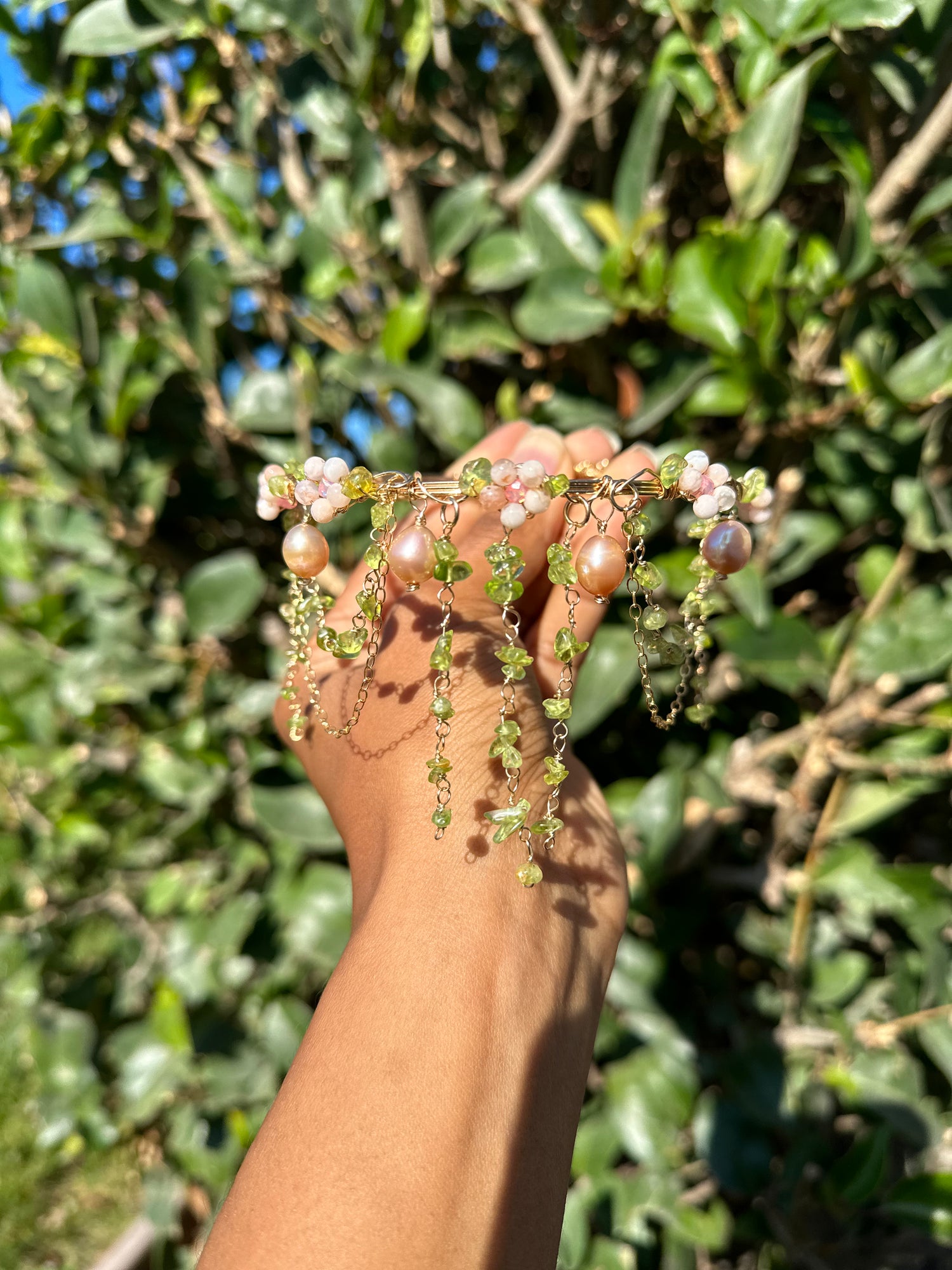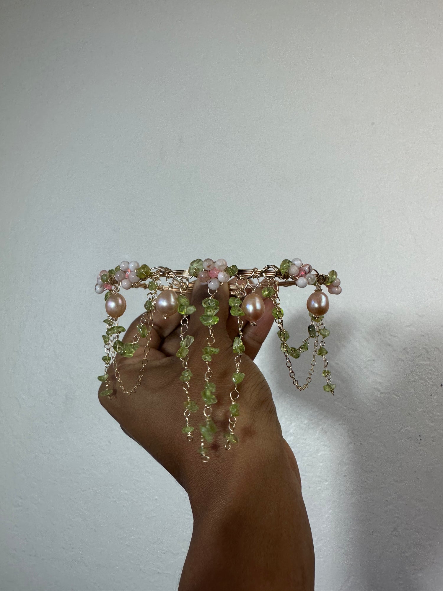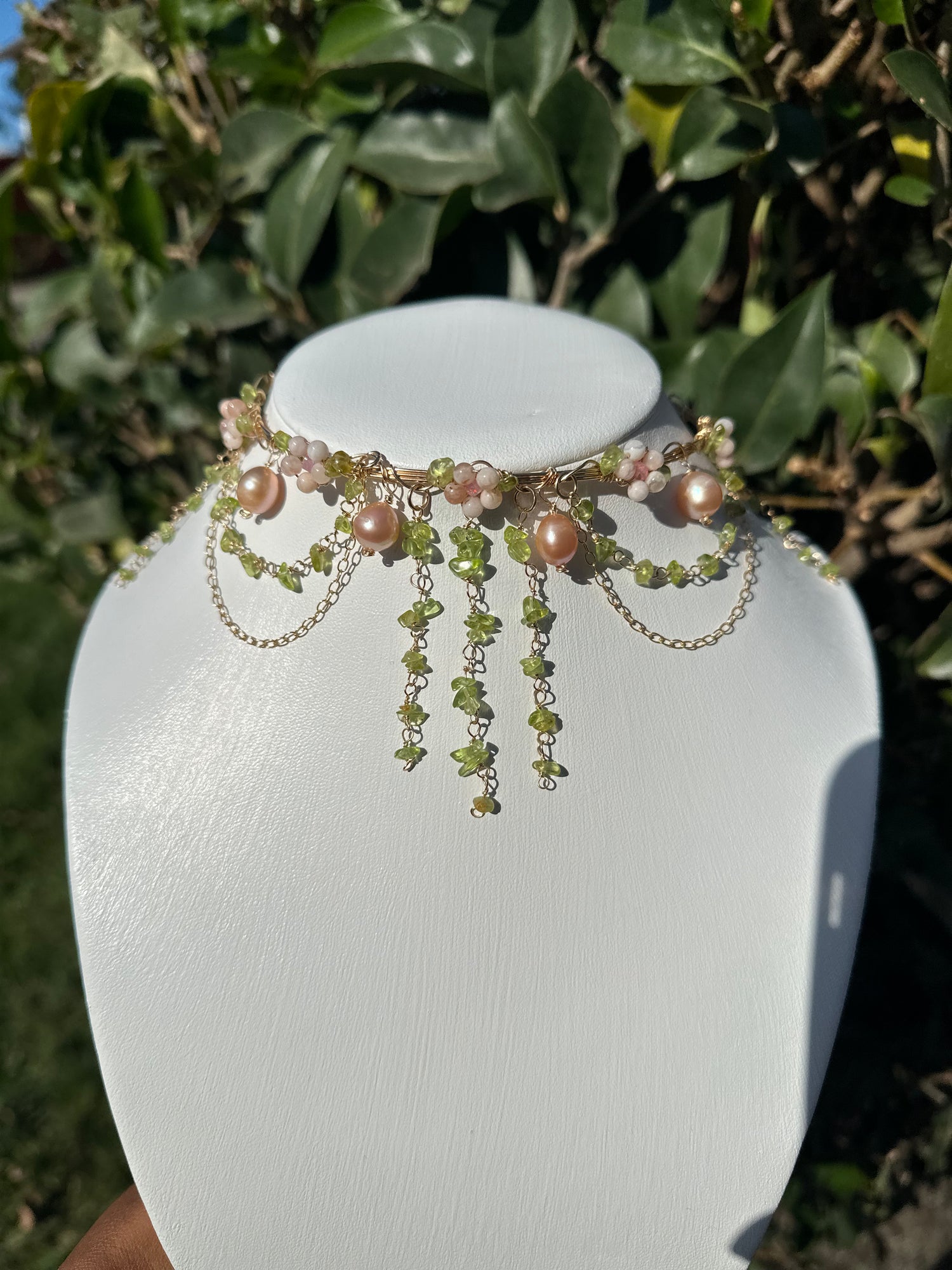 Handmade 14k Gold Filled choker with flower agate , Pink fresh water pearls , Pink Opal , and peridot.