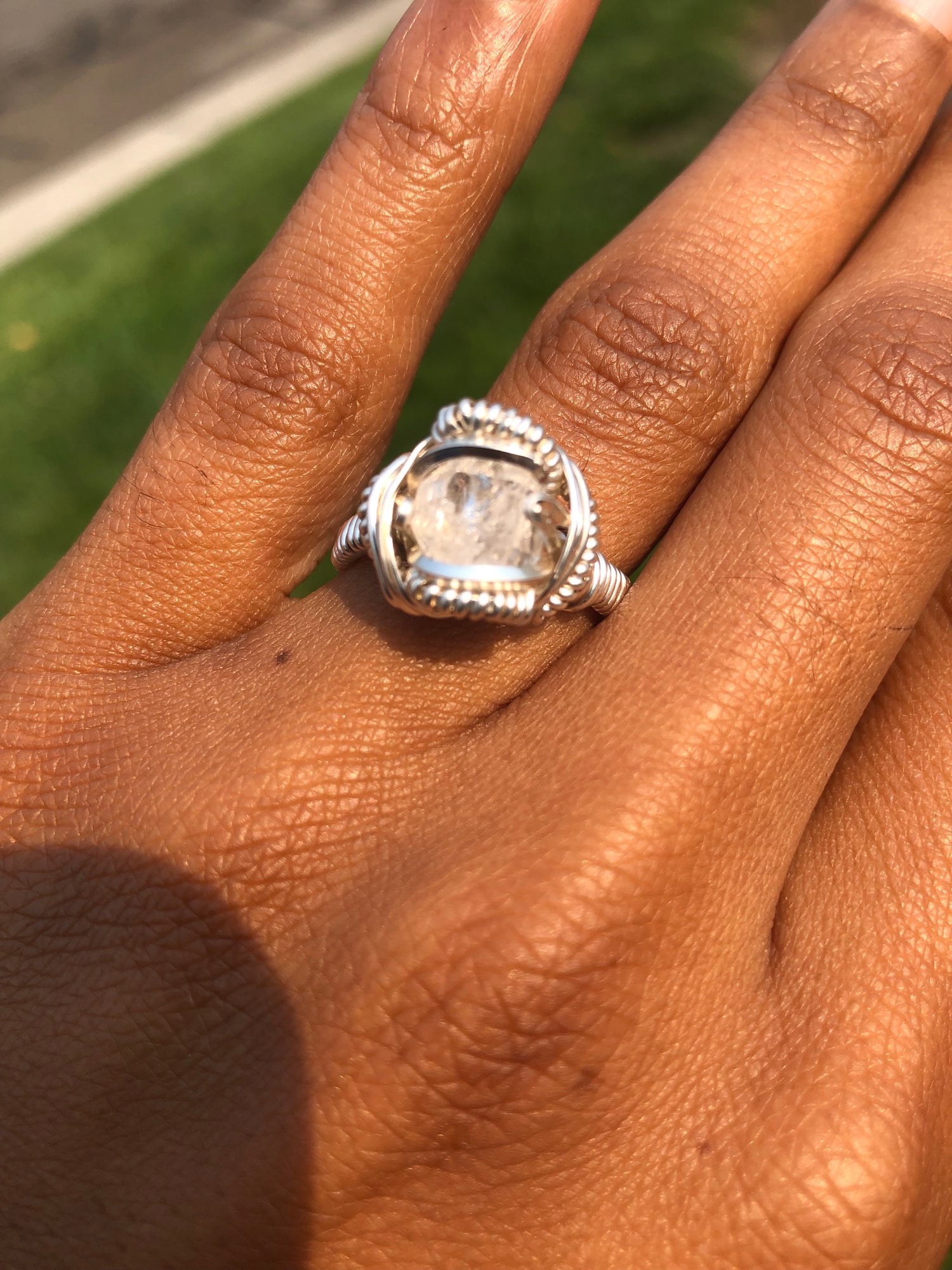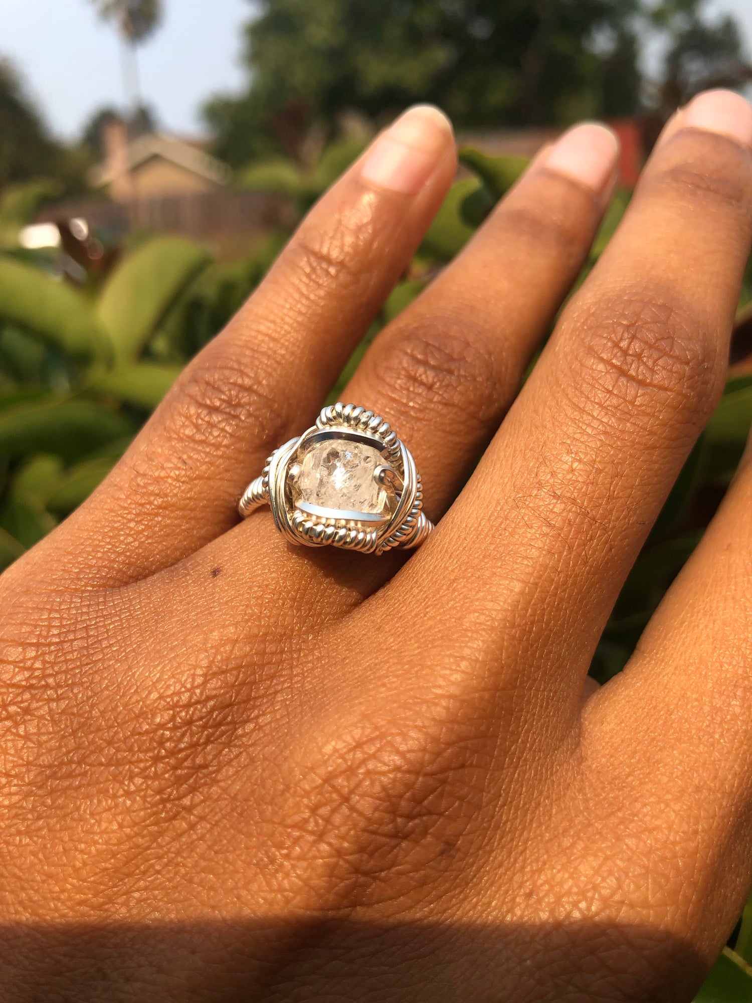 A Custom high vibrational Herkimer Diamond Wire Wrapped Silver Ring with beautiful rainbow inclusions.