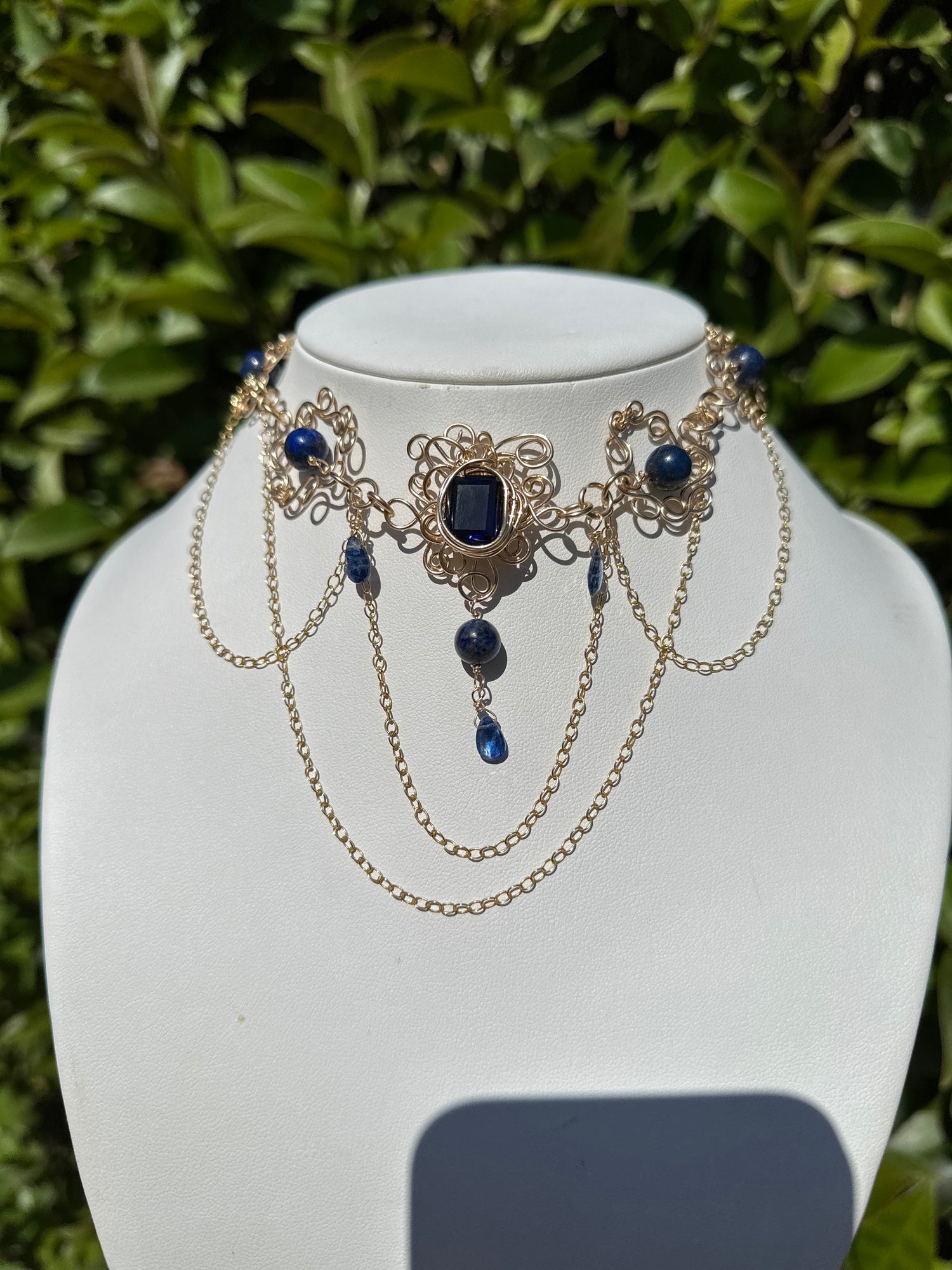 A gold filled adjustable choker with sapphire, lapis lazuli, and kyanite.