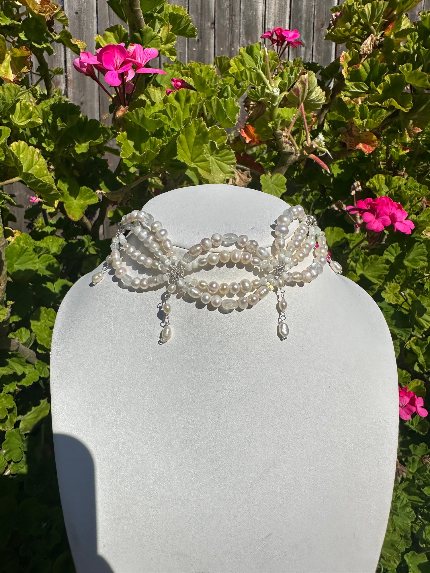 Handmade sterling silver choker made with fresh water pearls , opal, ivory , and moonstone