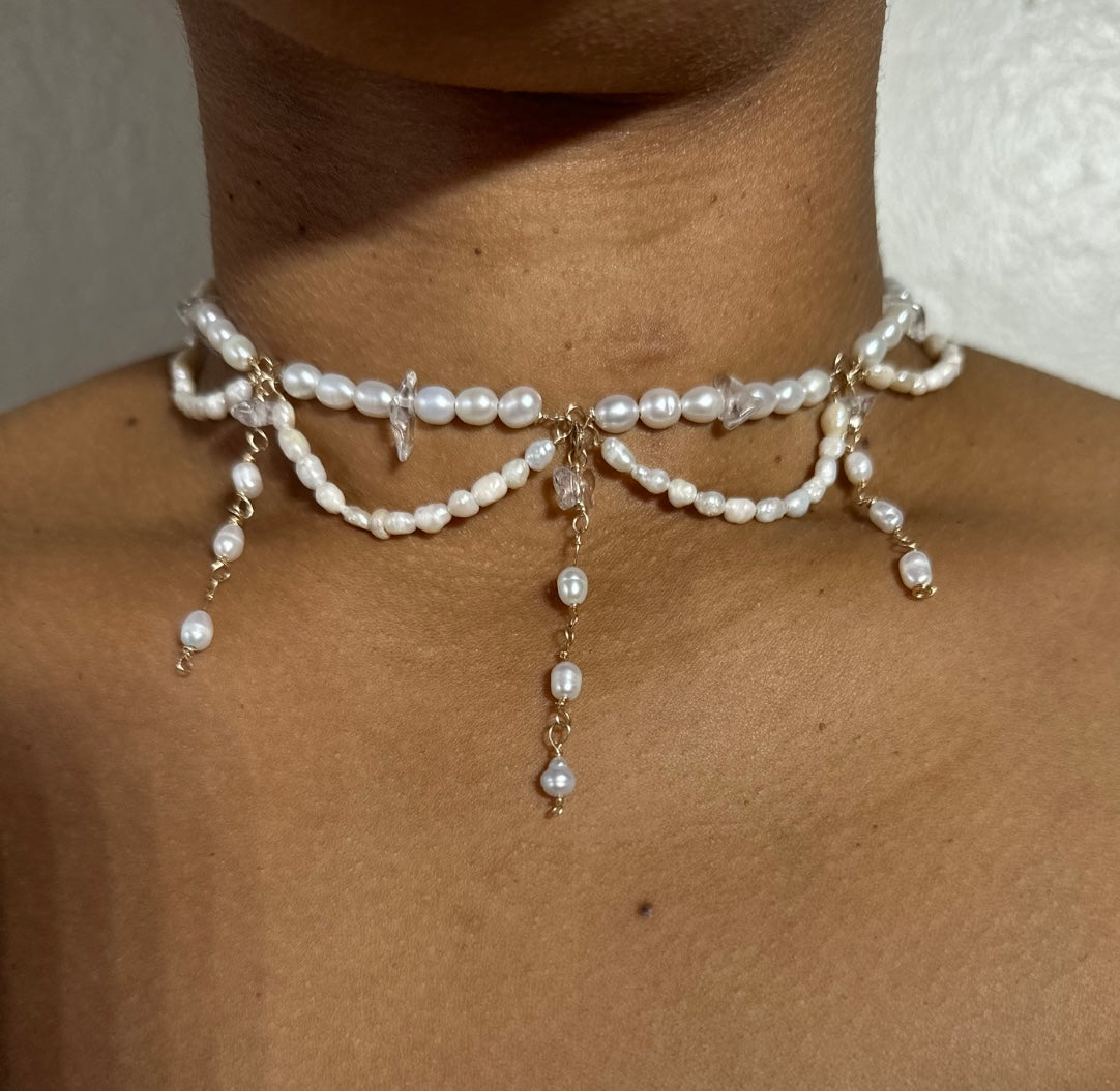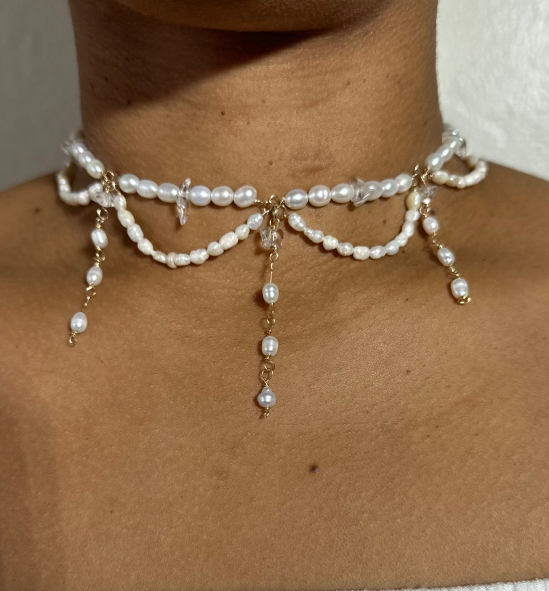 Handmade fresh water pearl necklace with clear quarts , and butterfly crystal.